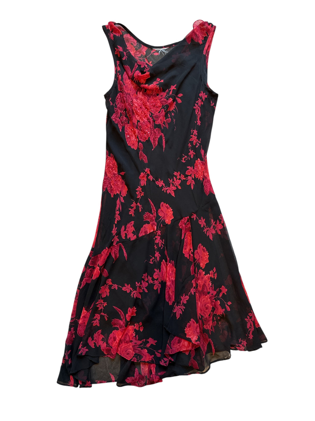 black red 90s floral beaded cowl neck dress