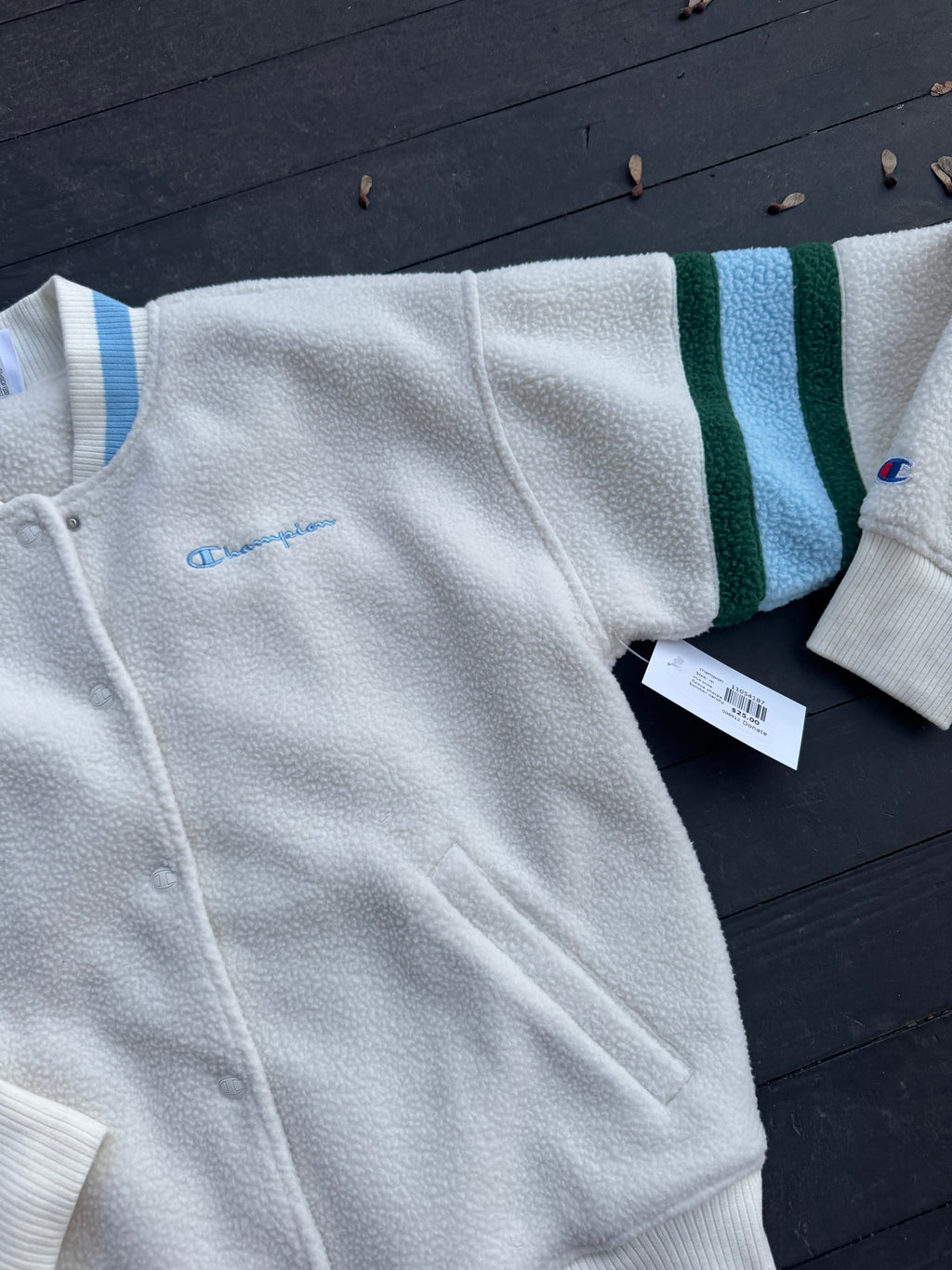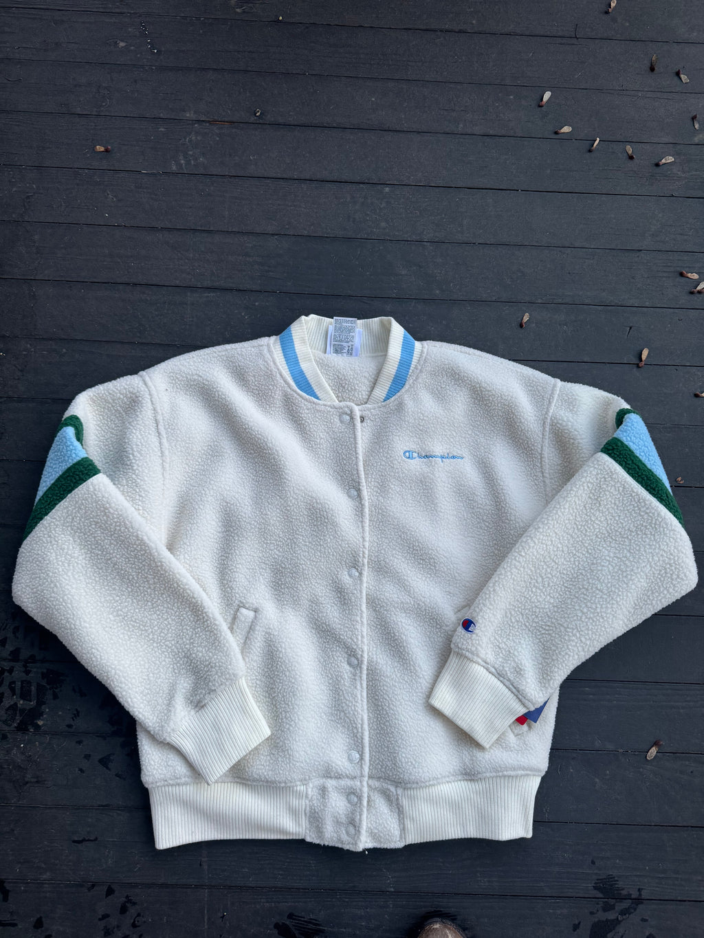 blue white champion fleece sherpa bomber varsity jacker, m