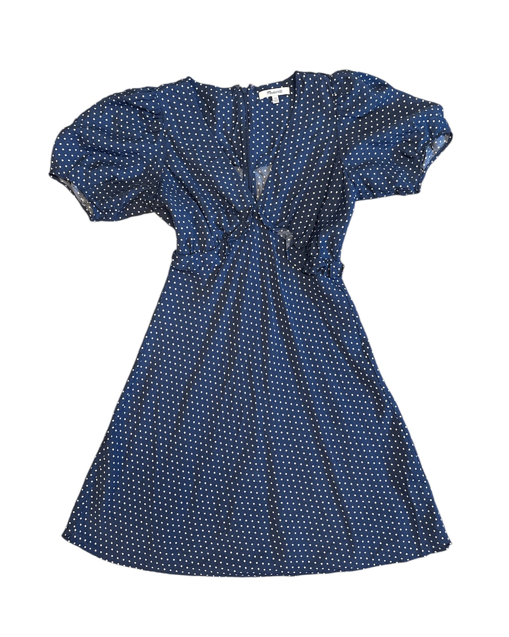 blue whtie madewell polka dot bustier ruffle dress, 00