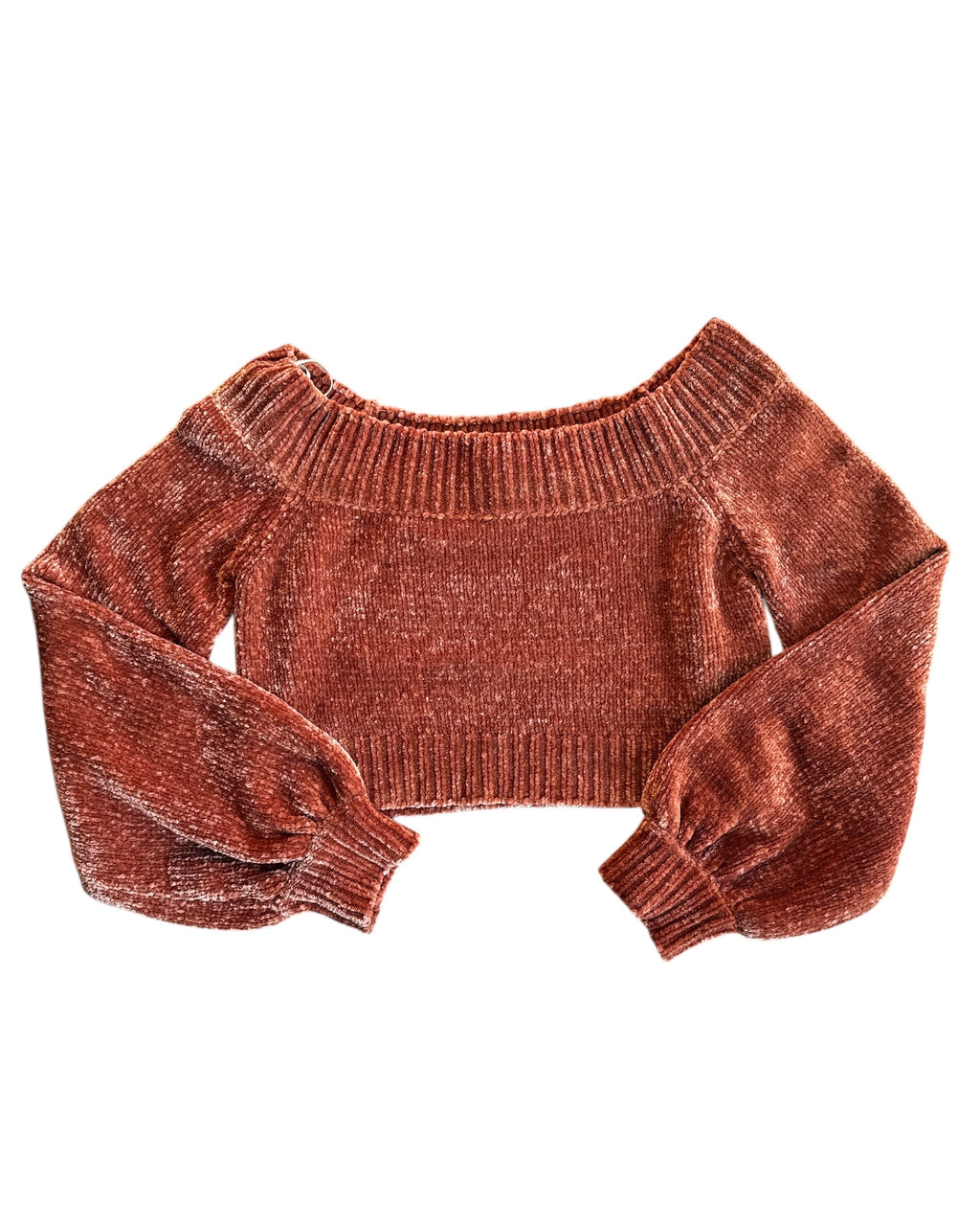 brown cliche chenille off shoulder sweater, xs