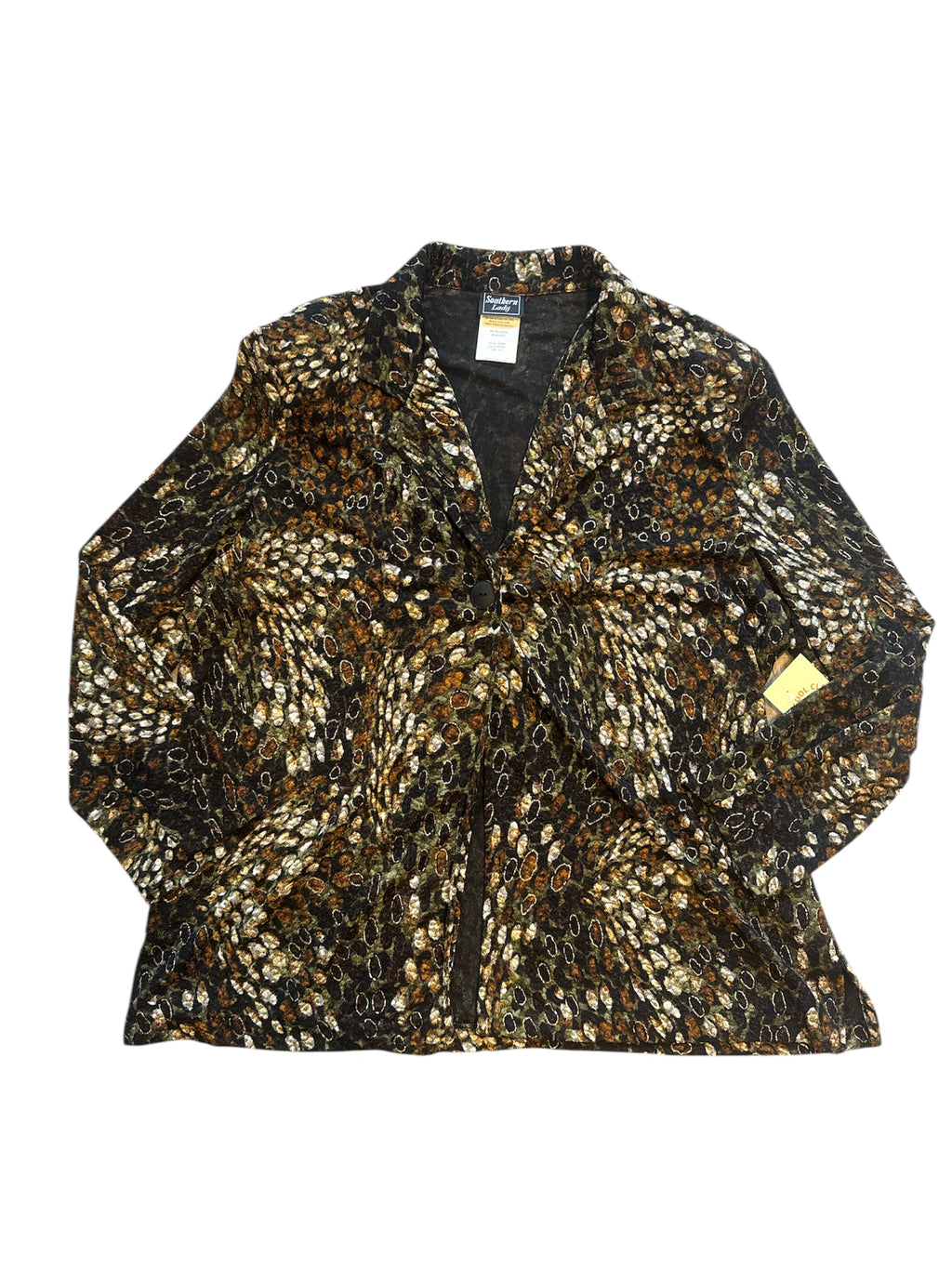 brown soutern lady patterned slinky ls cardigan top, `1x
