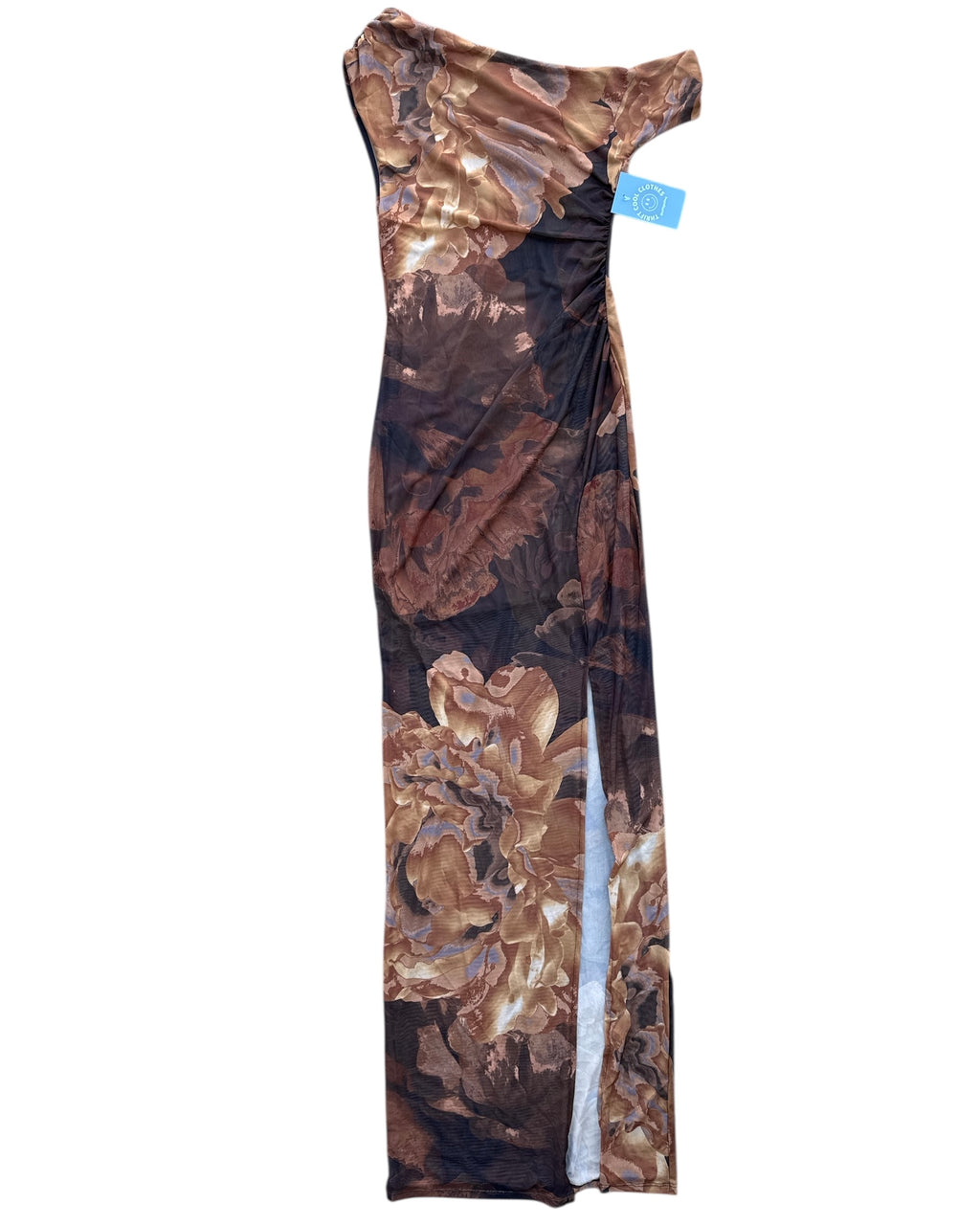 Brown tan Fashionnova Floral ruched off shoulder long dress, M