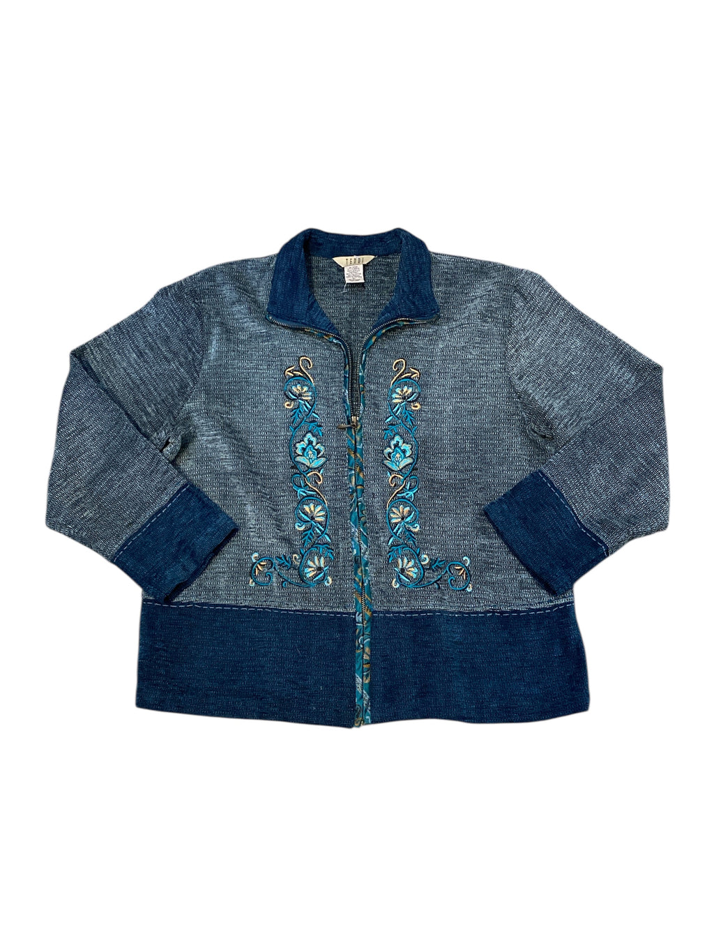 dark blue teal tan teddi embroidered floral textured sweater, PL