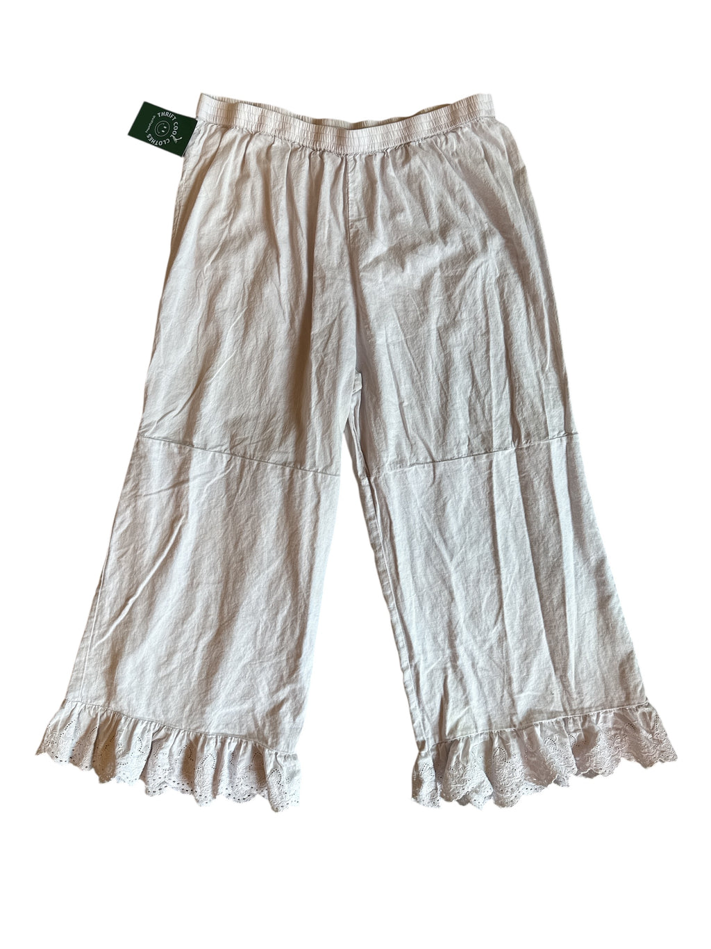 white soft surroundings flowy pant w embroidered lettuce trim, L